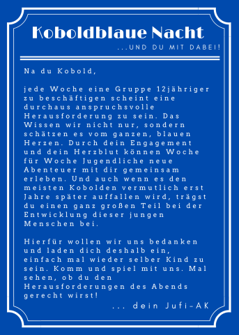 Du hast Lust gemeinsam mit anderen Jufileitenden gegen unseren AK anzutreten? Du hast Lust einfach mal wieder viele bekannte, aber auch neue Gesichter zu sehen? Du hast Lust einfach mal einen Abend wieder Teilnehmer*in zu sein?