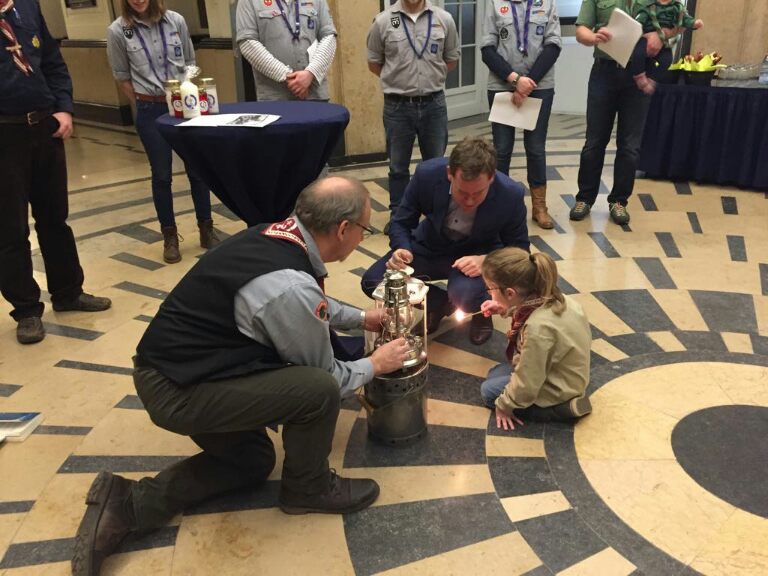 18.12. Kiel: Auf dem Weg zum Frieden. Thorsten Z. vom VCP hilft Olivia R. Sie ist Wölfling unserer DPSG Siedlung in Kiel und übergibt das Friedenslicht an Ulf Kämpfer, Oberbürgermeister von Kiel.