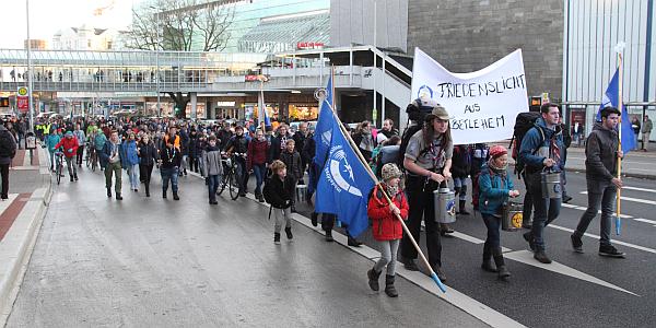 Auf dem Weg zum Frieden durch die Stadt Kiel. Alle haben das Licht bereits am Bahnhof erwartete und begleiten es jetzt zur Jakobikirche.