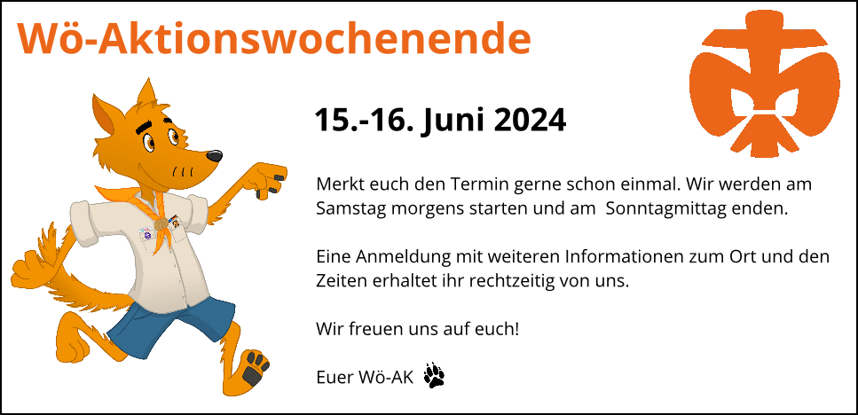 Wir werden am Samstagmorgen starten und Sonntagmittag enden. Alle weiteren Informationen erhaltet ihr rechtzeitig im Rahmen einer Anmeldung von euren Wö-Leiter*innen.
