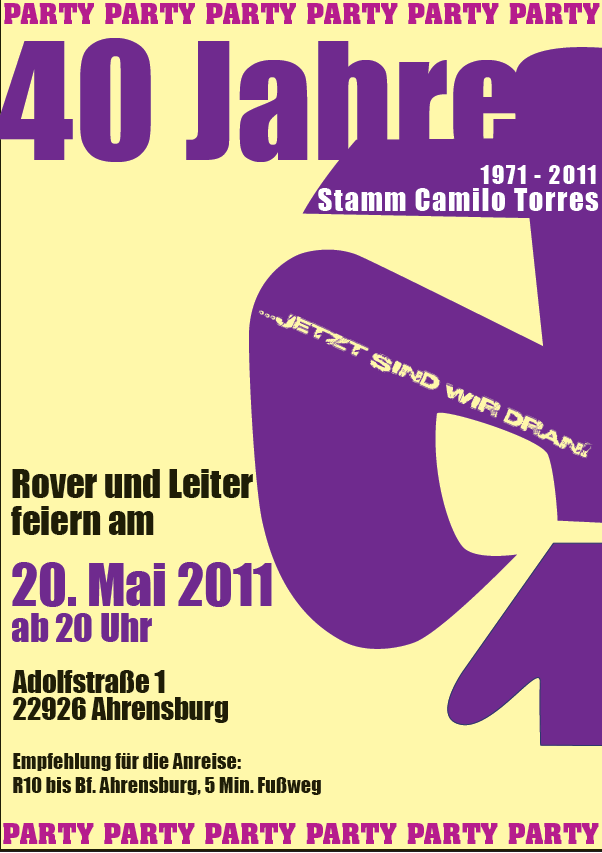 Der Stamm Camilo Torres, Ahrensburg, lädt alle Leiter und Rover der Diözese Hamburg zur Feier seines 45 jährigen Stammesjubiläums ein. Gefeiert wird am Samstag, 23.04.2016, ab 20:00 Uhr im Gemeindezentrum von St. Marien (Adolfstraße 1, 22926 Ahrensburg). Wie ihr dem Flyer entnehmen könnt, wird es nachts einen Shuttleservice geben, der euch bis U-Volksdorf fährt, damit ihr von dort mit der U1 Richtung Hamburg zurückfahren könnt.