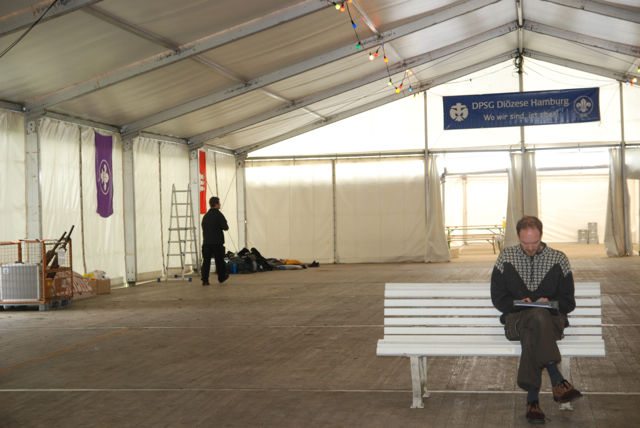 Obwohl das Pfingstlager "EinNorden 2010 - Einfach mehr Hanse" erst morgen beginnt, wimmelt es in Tohoopstedt schon von Pfadfindern. Die letzten Handgriffe werden getätigt, der Platz vorbereitet und die Bühne eingeweiht - bis morgen sollte alles stehen! Die Lebensmittel sind eingetroffen und in der Küche wird unser erstes selbstgekochtes Essen vorbereitet.
