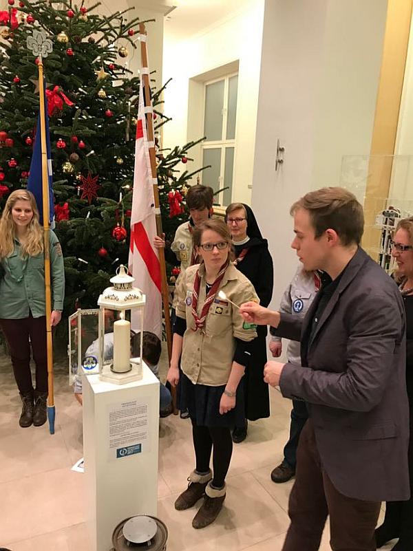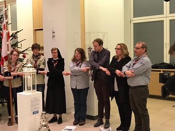18.12. Kiel: Auf dem Weg zum Frieden. Thorsten Z. vom VCP hilft Olivia R. Sie ist Wölfling unserer DPSG Siedlung in Kiel und übergibt das Friedenslicht an Ulf Kämpfer, Oberbürgermeister von Kiel.
