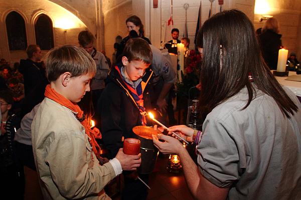 Philipp D. entzündet die Kerze für den Stamm Camilo Torres Ahrensburg und bringt es nach Ahrensburg, Bargteheide und Großhansdorf.